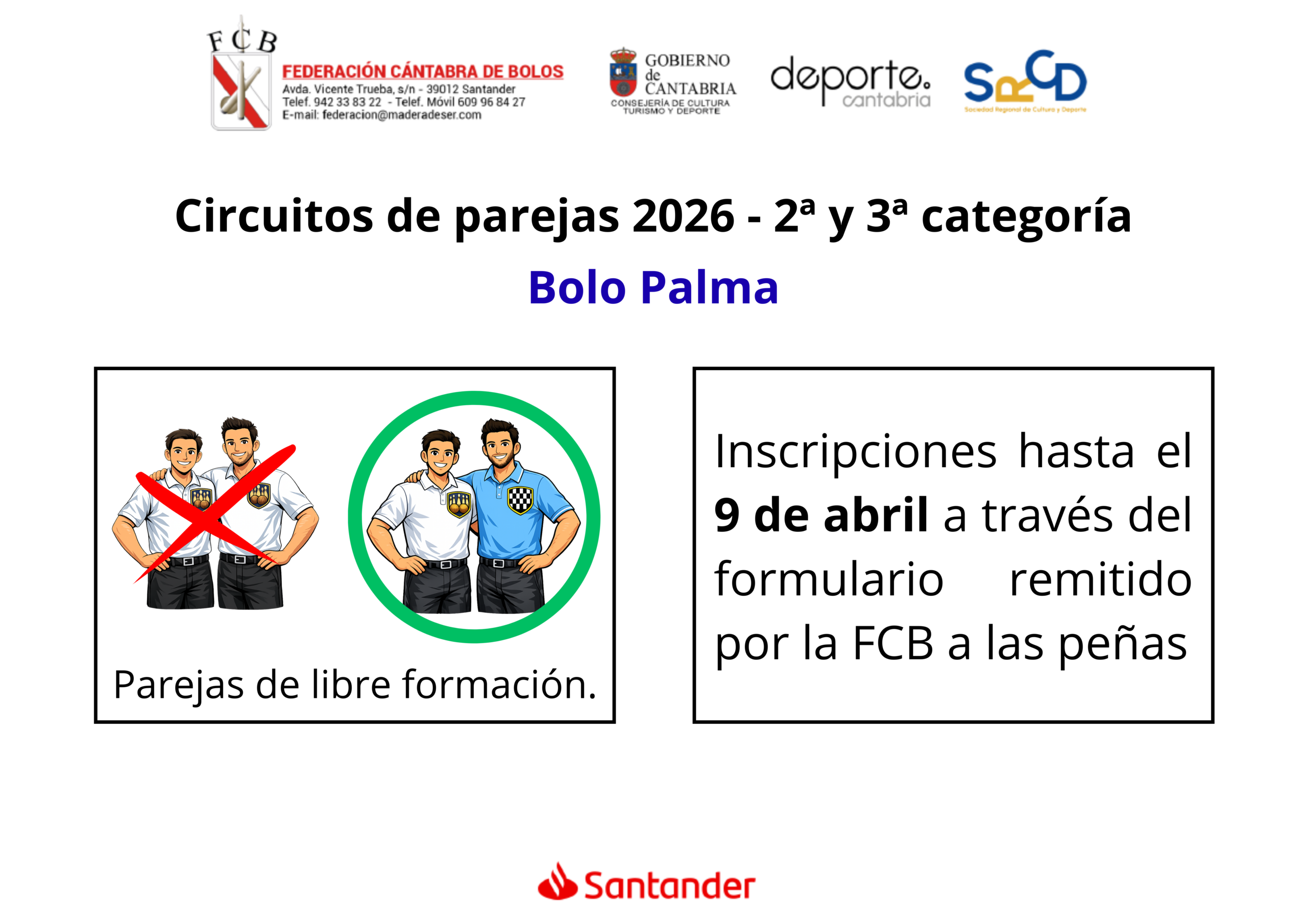 Se recuerda que este año 2ª y 3ª categoría deja de considerarse Campeonato de Peñas, pasando a ser de libre formación de las parejas entre dos jugadores de la misma categoría, y que aquellas parejas que quieran participar deben enviar inscripción a la FCB, siendo la fecha límite hoy, 9 de abril.